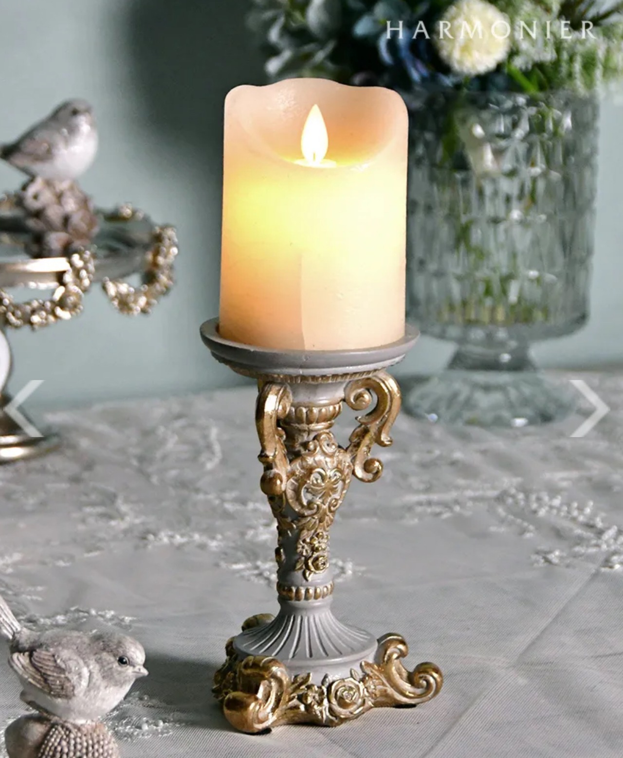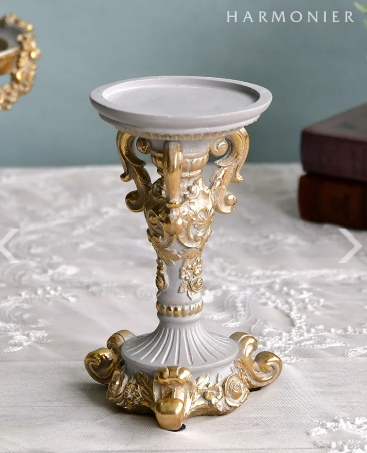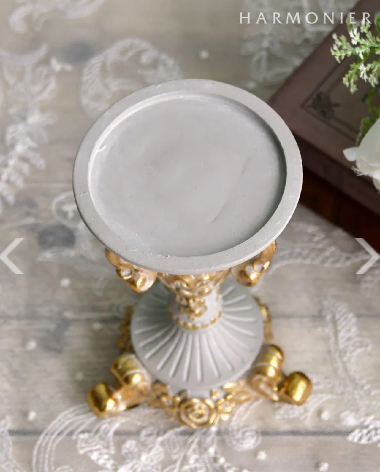 アンティーク調のおしゃれなキャンドル用スタンド。無駄を省いた華奢で美しい曲線の脚部とベースには、クラシカルなレリーフが施され、上品で高級感のある雰囲気です。食卓にも使いやすいサイズ感で、クラシカルなテーブルコーディネートに花を添えてくれます。