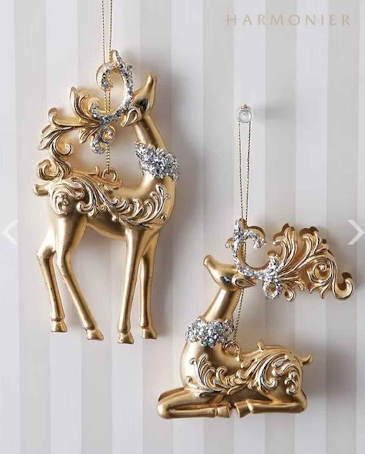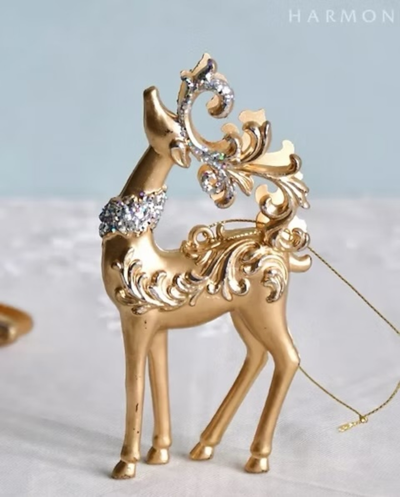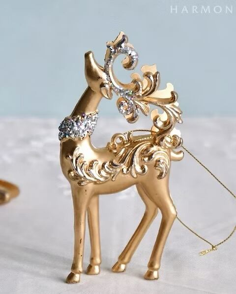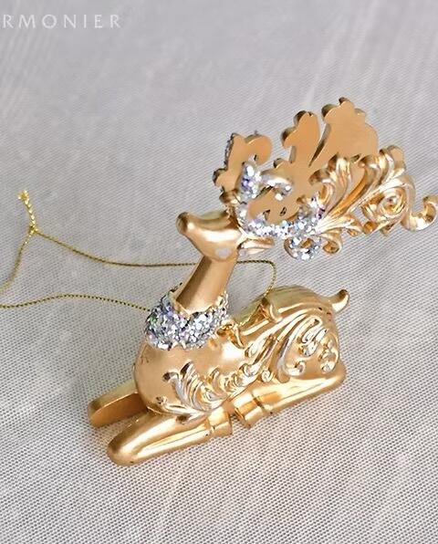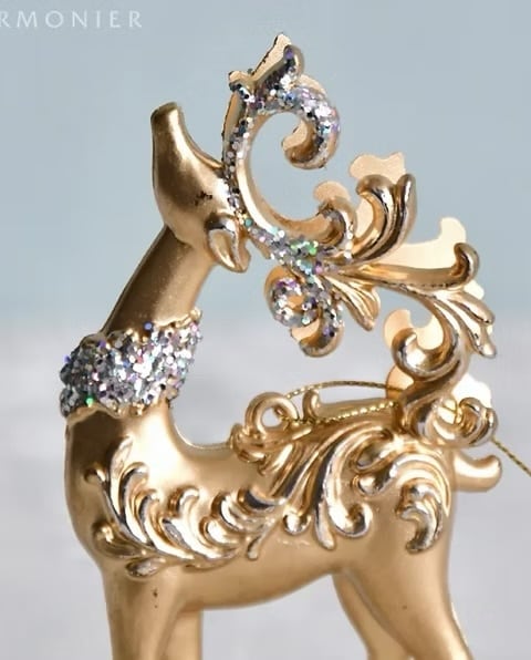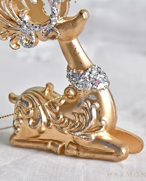 クラシカルなアラベスク模様が入った明るいゴールドカラーのトナカイのクリスマスオーナメント。曲線の美しい角や首飾りにラメを装飾した華やかなデザインで、クリスマスツリーによく映えます。どんな色のオーナメントとも合わせやすいカラーで、様々なデコレーションに活躍します。90cm以上のクリスマスツリーの装飾に最適なサイズのオーナメントです。