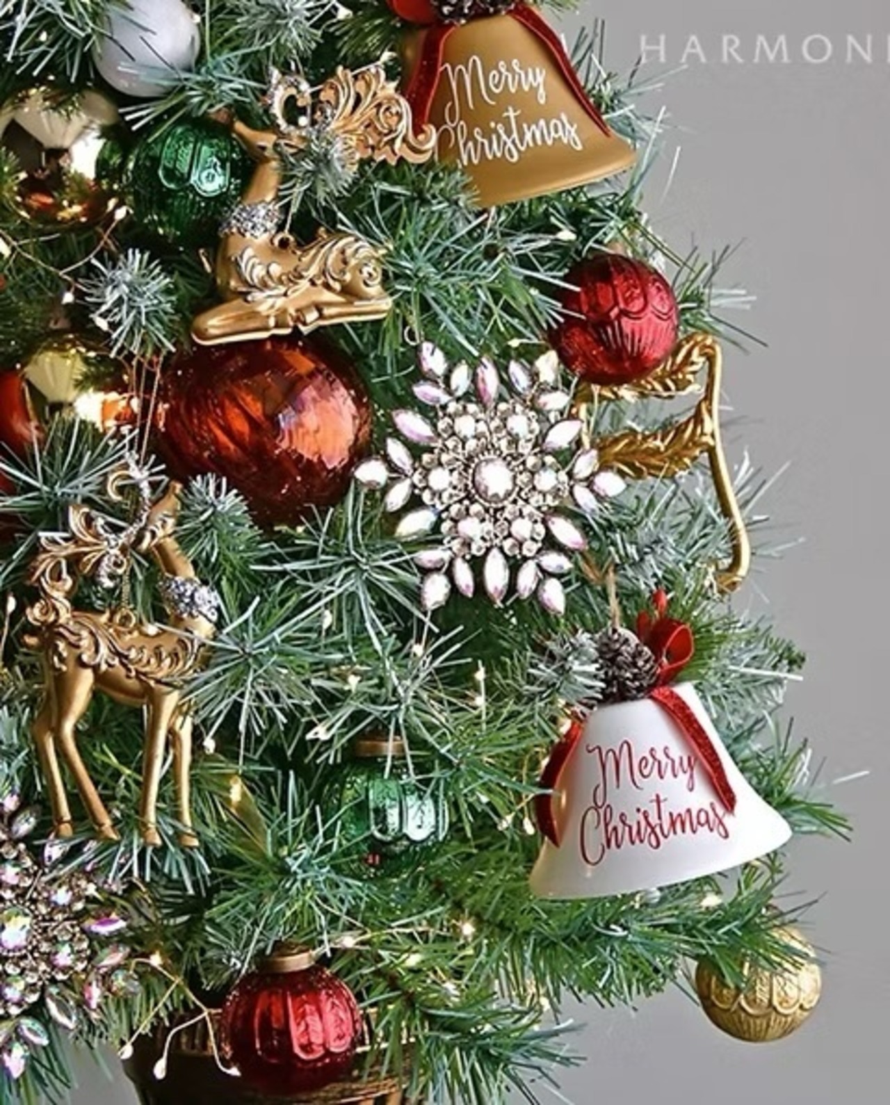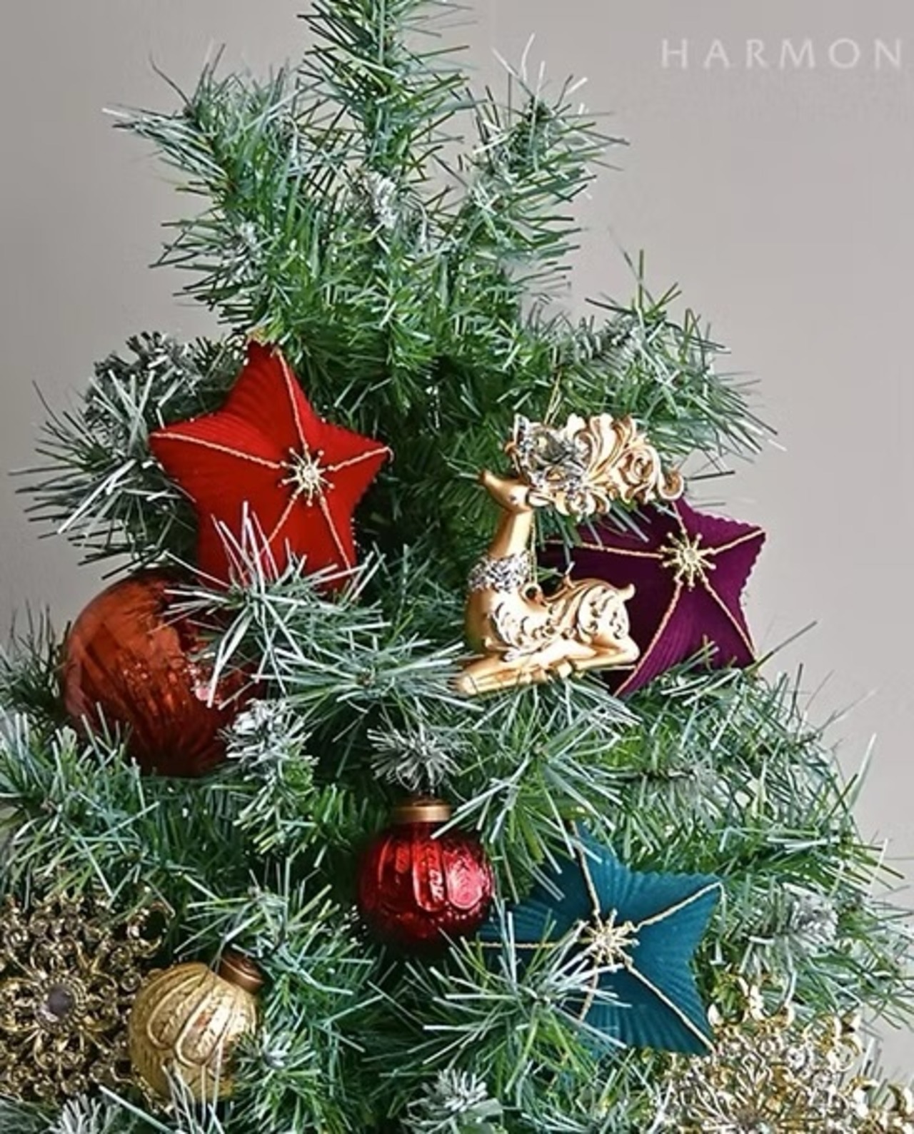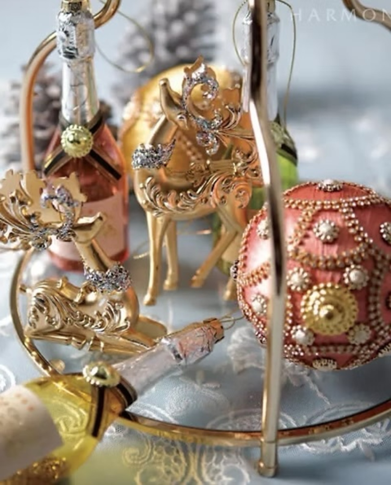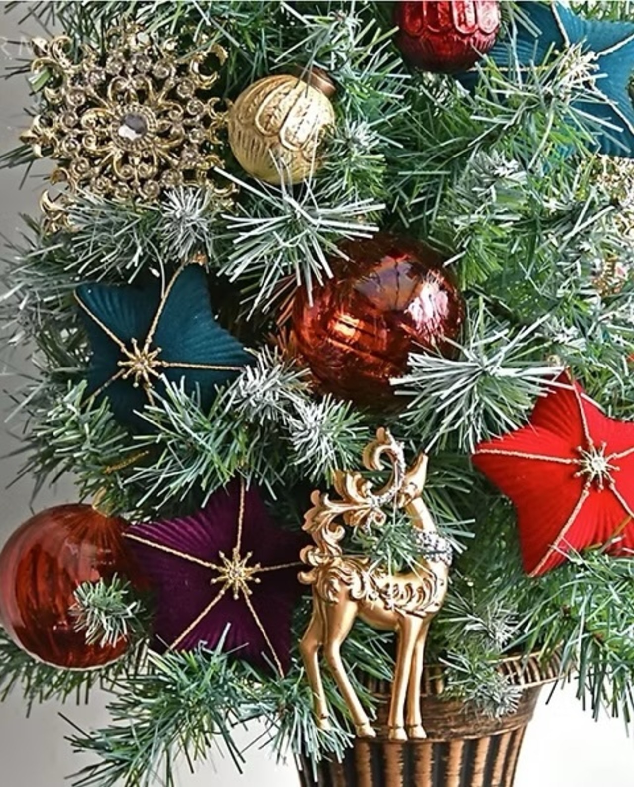 クラシカルなアラベスク模様が入った明るいゴールドカラーのトナカイのクリスマスオーナメント。曲線の美しい角や首飾りにラメを装飾した華やかなデザインで、クリスマスツリーによく映えます。どんな色のオーナメントとも合わせやすいカラーで、様々なデコレーションに活躍します。90cm以上のクリスマスツリーの装飾に最適なサイズのオーナメントです。